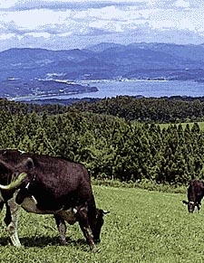 町営大盤平放牧場は360°の大パノラマ。のんびり牛と遊ぶことができます。さらに歩いて、翁倉山は天然記念物イヌワシの生息地。運が良ければ出会えるかも?