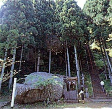 御神体である巨石が、中腹より突き出し、しめ縄が巻かれている男の神様。その下に横たわっている女の神様として祀られ、縁結び、子孫繁栄、家内安全、大漁豊作など繁栄の神様として信仰されています。 また、御神体が落ちそうで落ちないことから、合格祈願に受験生たちがお参りに来るようにもなりました。