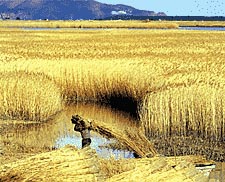 東北随一の大河、北上川。その河口には、肥沃で豊かな水をたたえ、様々な動植物が生息しています。とくに河口から上流10kmにかけて、ヨシ原の大群落が開放的な空間をつくりだし、川面を渡るそよ風、時には波しぶきを上げた荒れ狂った風。ヨシ原は、水鳥を懐に包み込み、大自然との囁きを醸し出します。